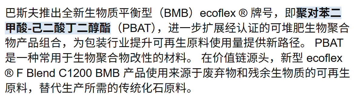 PBAT是聚对苯二甲酸-己二酸丁二醇酯,是一种*可堆肥降解*的生物基塑料。巴斯夫通过*生物质平衡(BMB)* 方法,使用可再生原料生产它,
