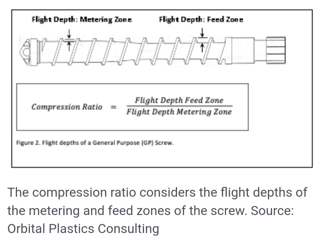 通用螺杆的范围在 2.0 到 3.5:1 之间。较大的压缩比会增加剪切热、熔体温度和熔体降解的风险。