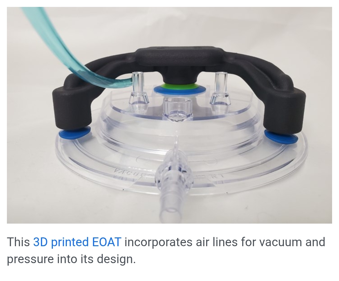 协作机器人、拾取放置机器人等自动化设备能提升塑料加工效率,但大多需要定制化的臂端工具与夹具。3D打印可生产真空吸盘等专用末端