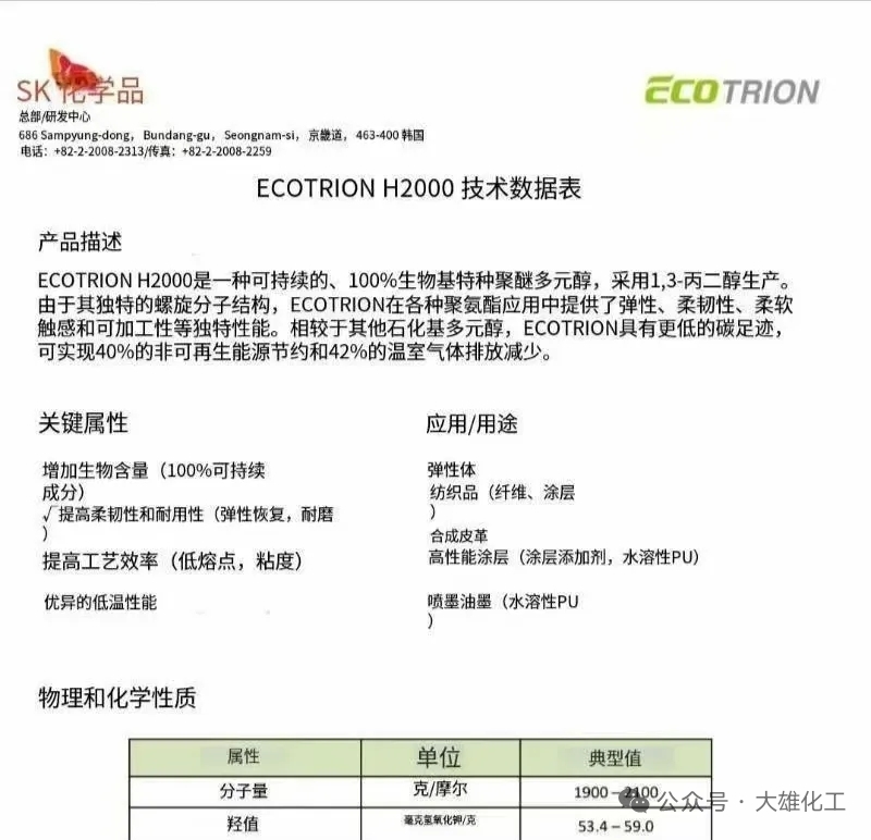 PO3G又叫聚三亚甲基醚二醇、聚1,3丙二醇,它是100%生物基聚醚多元醇。因其链段上有奇数个碳,具有独特的螺旋分子结构,所以相对于其