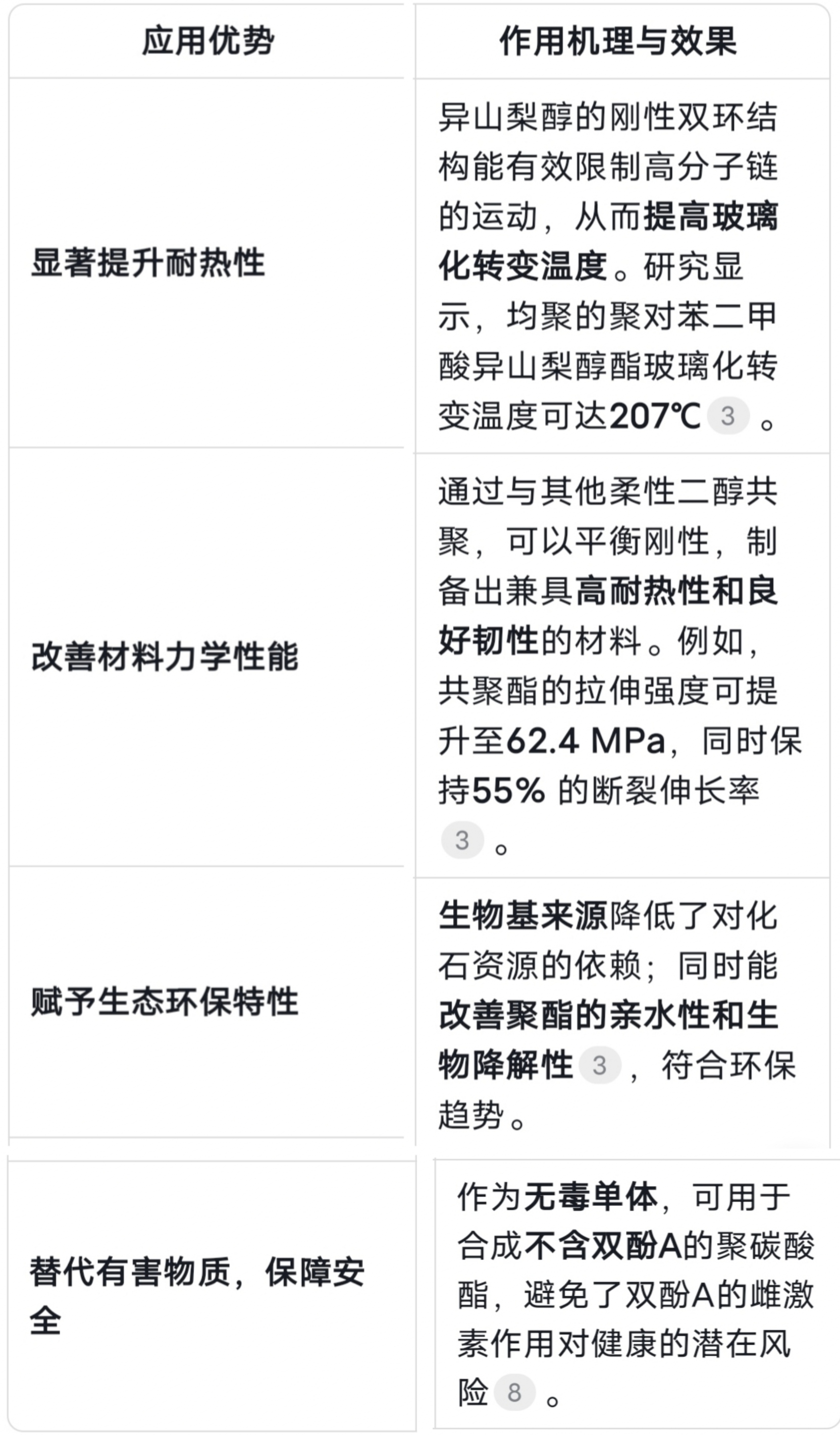 将异山梨醇作为共聚单体引入聚酯中,能显著提升和改善材料的多项性能,是其最重要的应用方向之一。