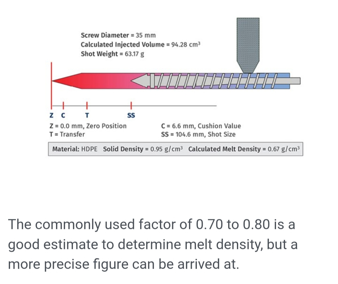 此处的熔体密度是固体密度的70%,即0.95克/立方厘米的0.70倍。重要的是要记住,这是在熔体温度380°F和背压500 psi下的结果。常用的0.70