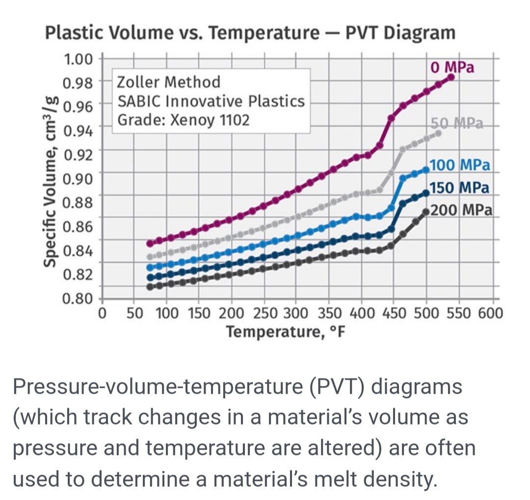 加入注塑机时,塑料熔化,分子彼此远离,从而降低了材料的密度。熔融材料的密度称为熔体密度。压力-体积-温度图常被用来确定材料的熔体密