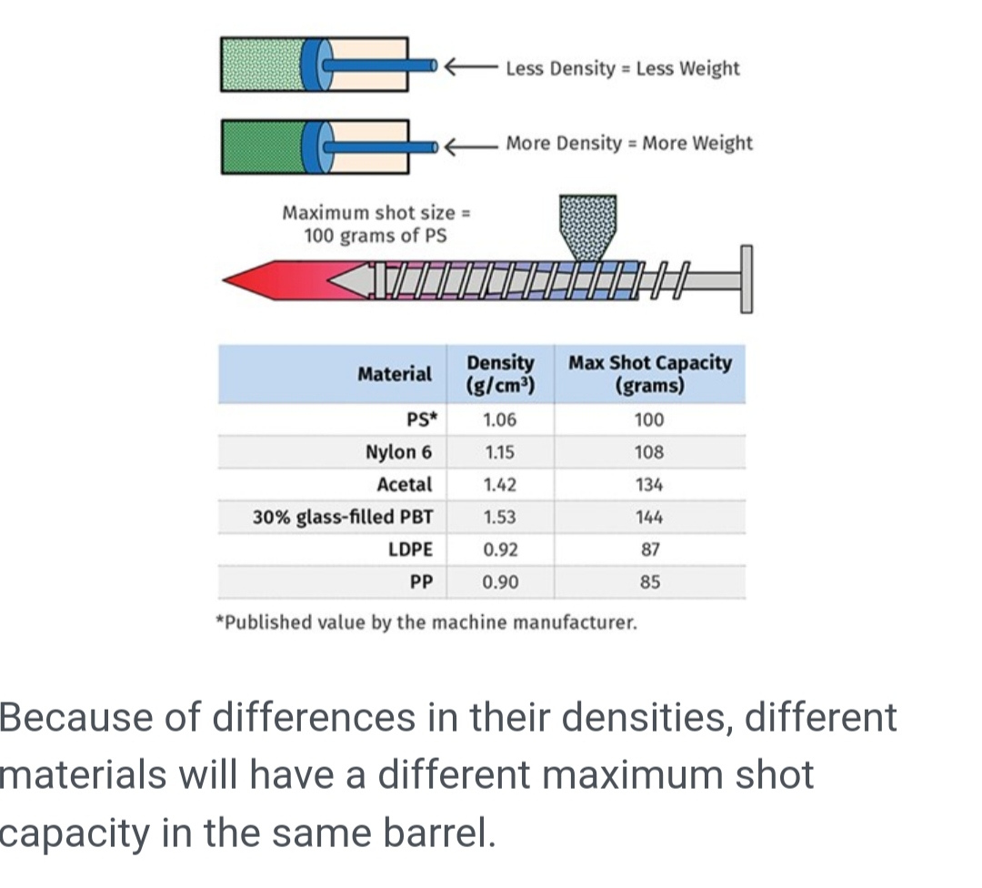 机筒使用百分比应基于机筒容量并考虑正在注塑的材料进行计算。因此,了解密度知识及其数值对于此类计算至关重要。