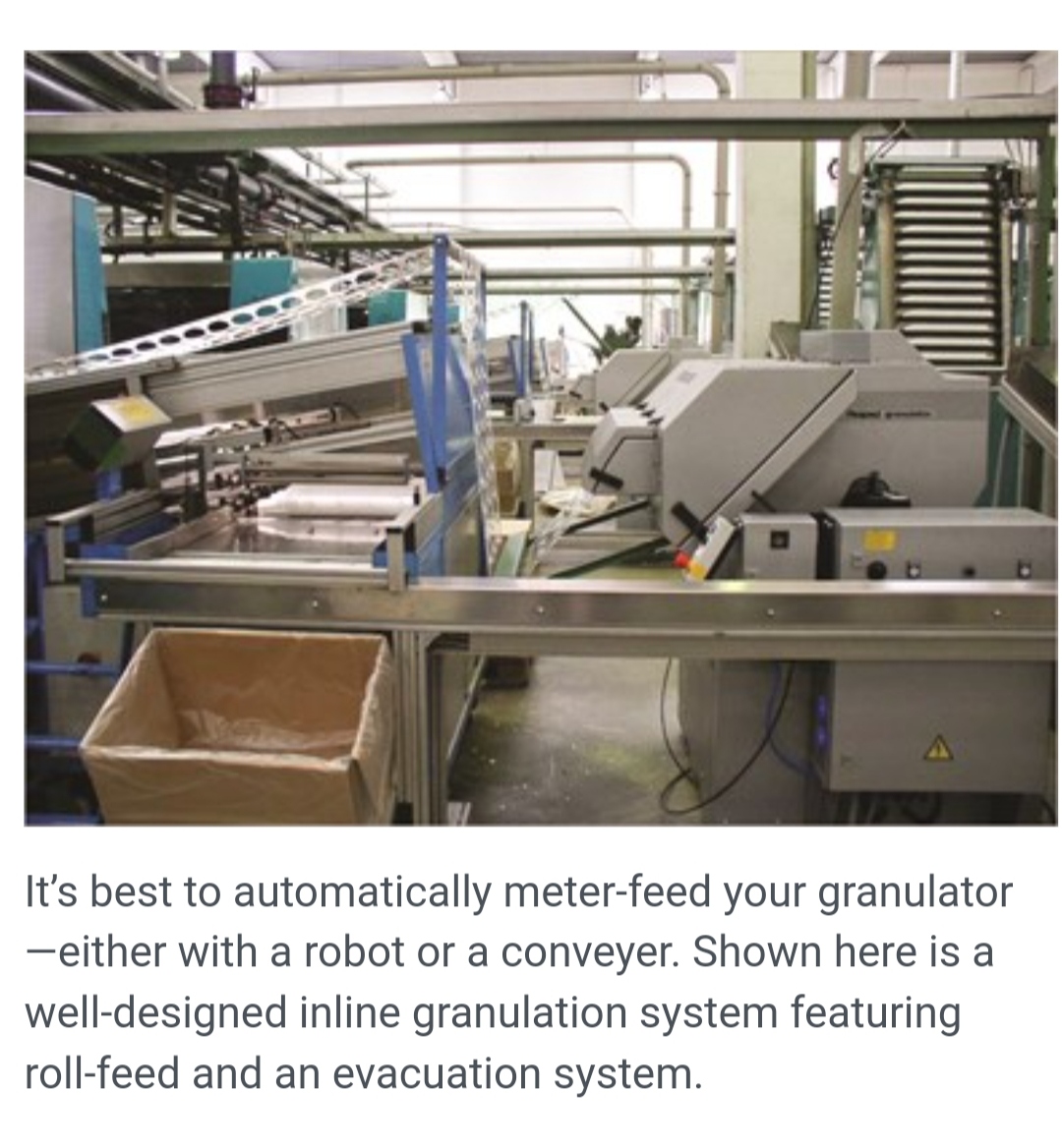 正如使用适当规格的抽吸系统自动将回用料从造粒机中清除更好一样,自动计量喂料——无论是通过机器人还是传送带——对你的造粒机也更好。