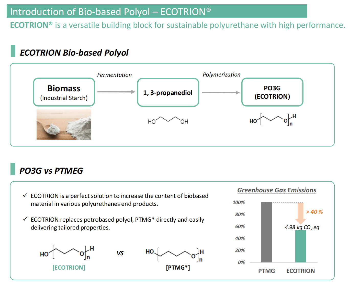 Commission)的生物周期评估认证,与传统多元醇相比,PO3G 能够减少制造过程中的温室气体排放。