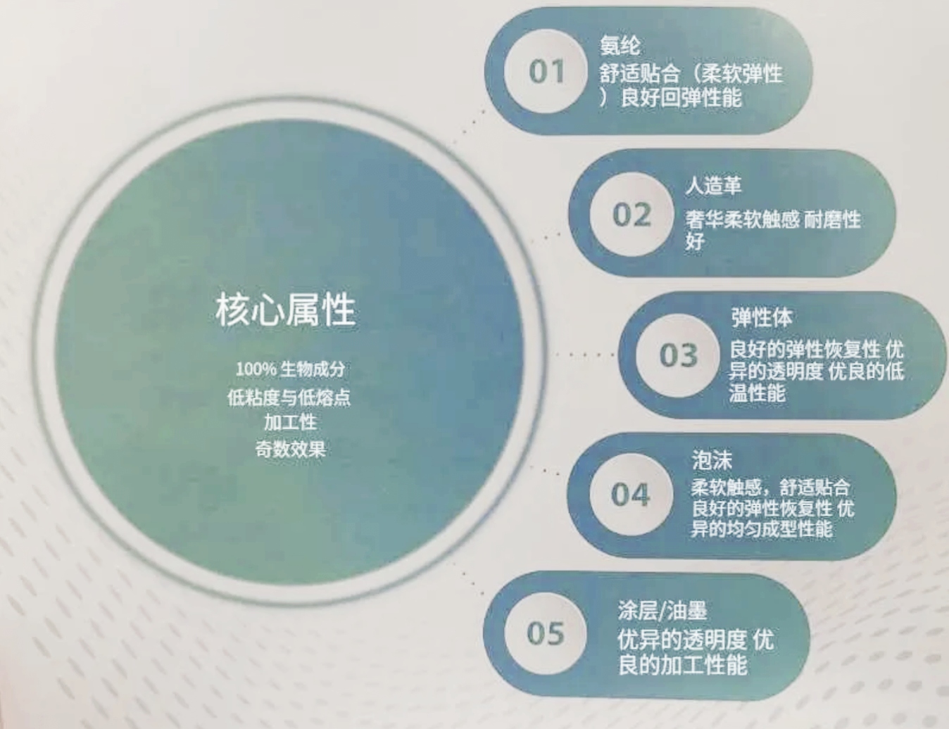 ~优异的耐水解性,低温柔韧性,很好的弹性及弹性恢复性,柔软触感与舒适穿着性,很好的耐磨与抗撕