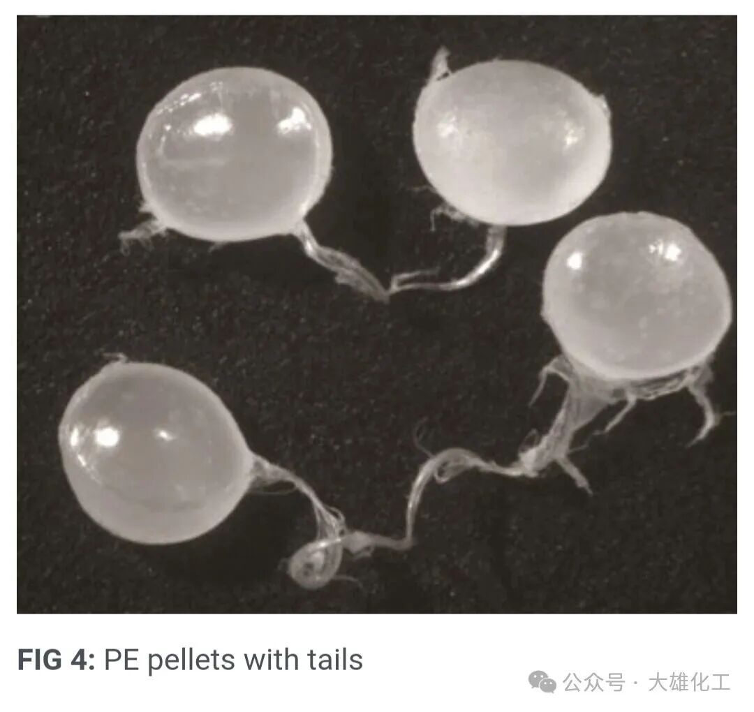 形成粒料拖尾,如果拖尾在干燥机中断裂,则会产生细粉。图 4 显示了带有拖尾的粒料。要排查粒料拖尾形成的原因,请验证以下事项: