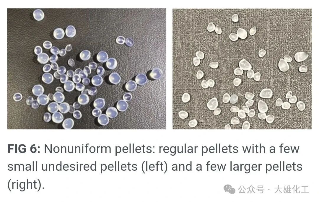 流动指数、窄分子量分布或高填料含量的牌号。拖尾与细粉、连粒与并粒、粒料结团与结块、熔体破裂以及粒料尺寸不均等缺陷,会降低下游
