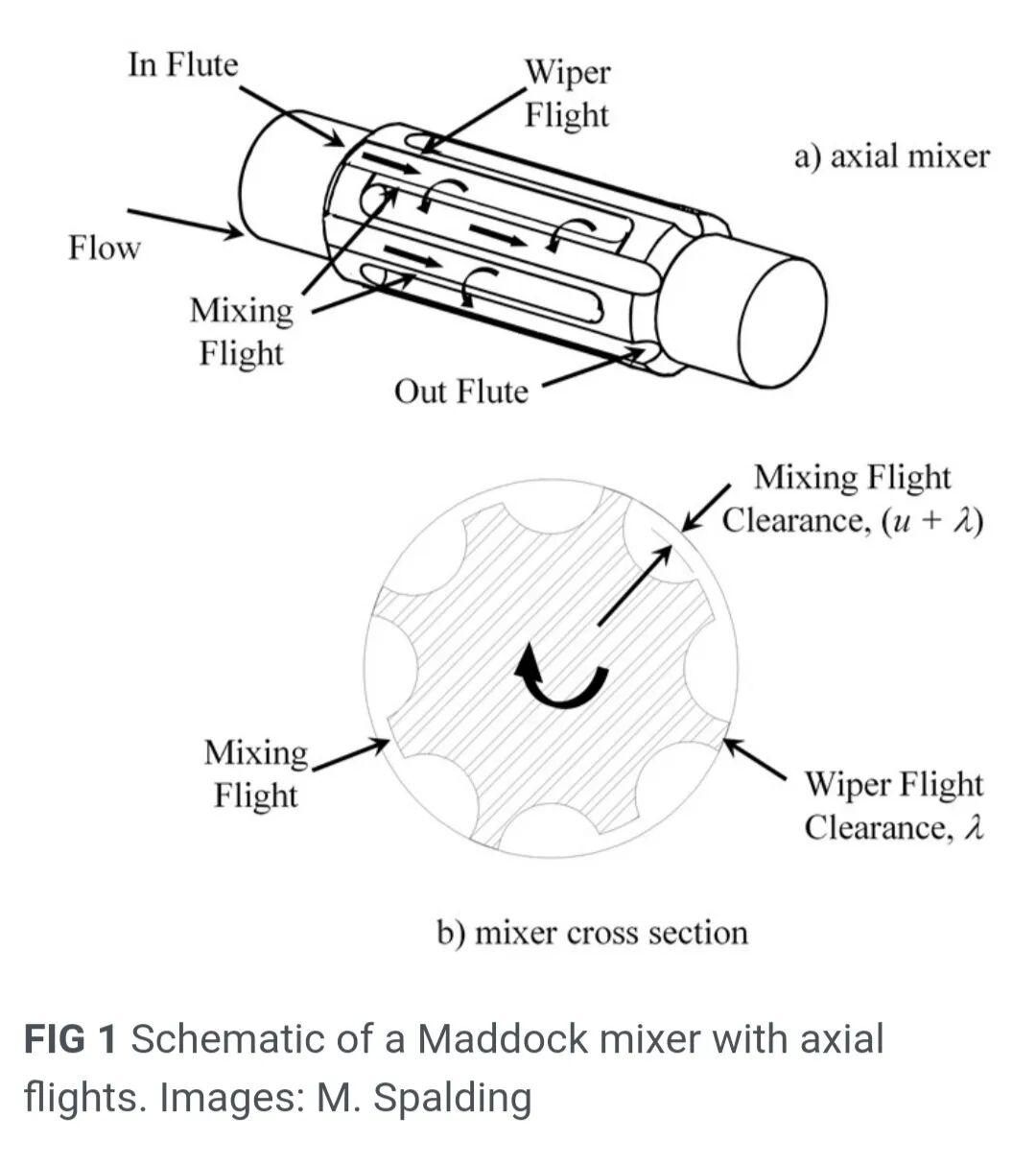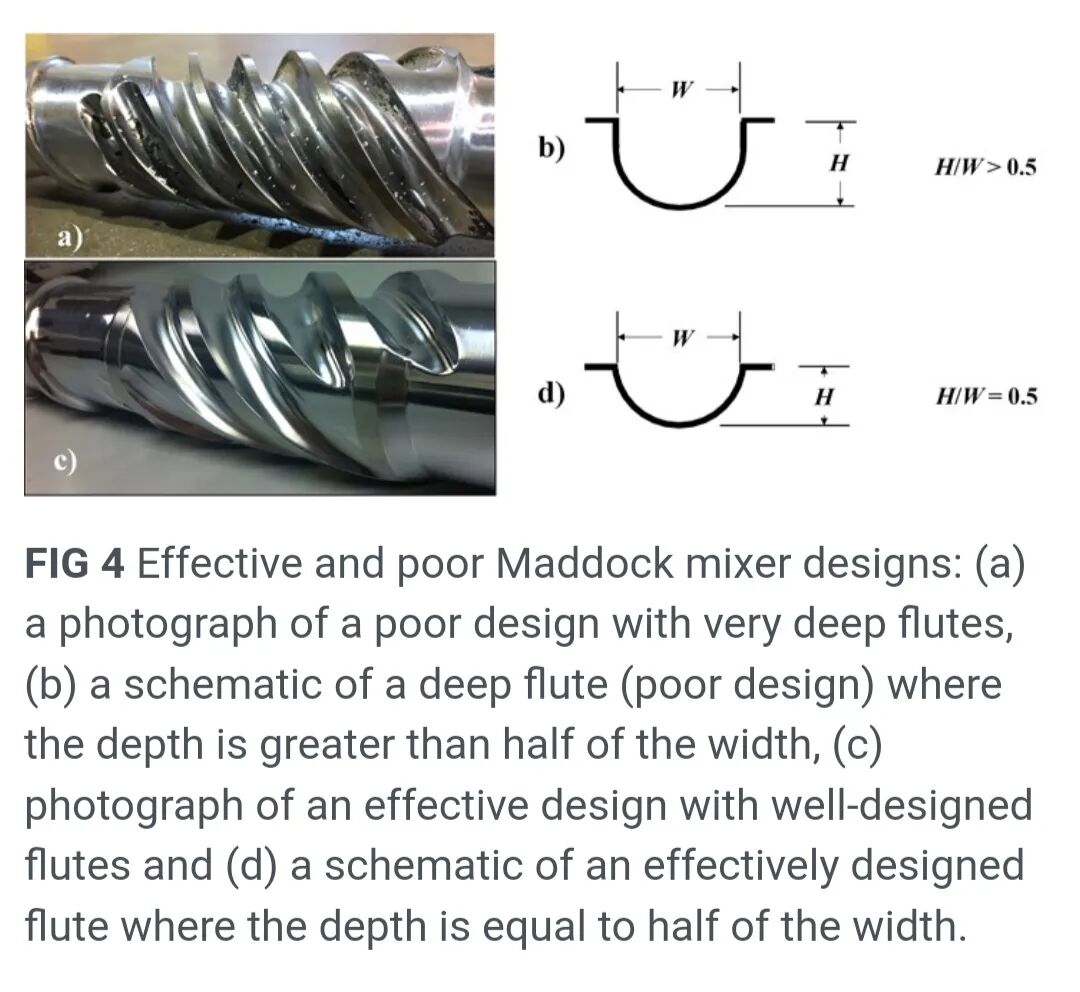 Maddock混合器是单螺杆挤出机优选的分散混合元件。其设计对于消除固态聚合物碎片和缠结PE凝胶至关重要。此外,槽的设计对于减轻树脂降解也至关重要。