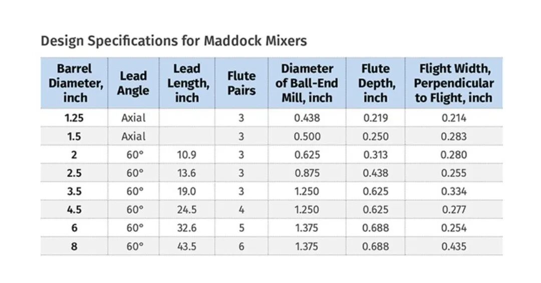 在为无定形和半结晶树脂设计单螺杆挤出机螺杆时,一个常见特征是在螺杆末端附近设置一个混合元件。对于许多应用而言,该混合元件应为分散型,以便在物料排入下游设备之前,能够捕集、熔融并分散固态聚合物碎片。有许多混合器可供选择,但Maddock混合器是许多应用中的优选。