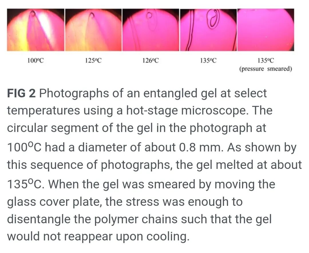 凝胶样品通常放在带有硅油的载玻片上,并盖上薄盖玻片。当样品加热至接近熔融温度,并用牙科工具推动盖玻片对凝胶施加应力时,凝胶会解缠结。此时当样品冷却后,凝胶不再重新形成。也就是说,施加的应力解开了链缠结,使其具有与薄膜其余部分相同的形态,从而不再可见。